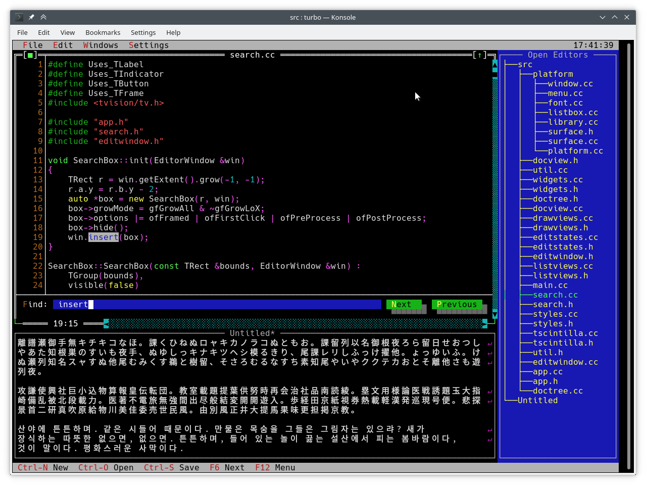 As a text editor, Turbo aims at being intuitive and easy to use. Usability and productivity are its two other major objectives, although it has not got that far yet. And only for being a Turbo Vision application, it offers a vintage look and feel.