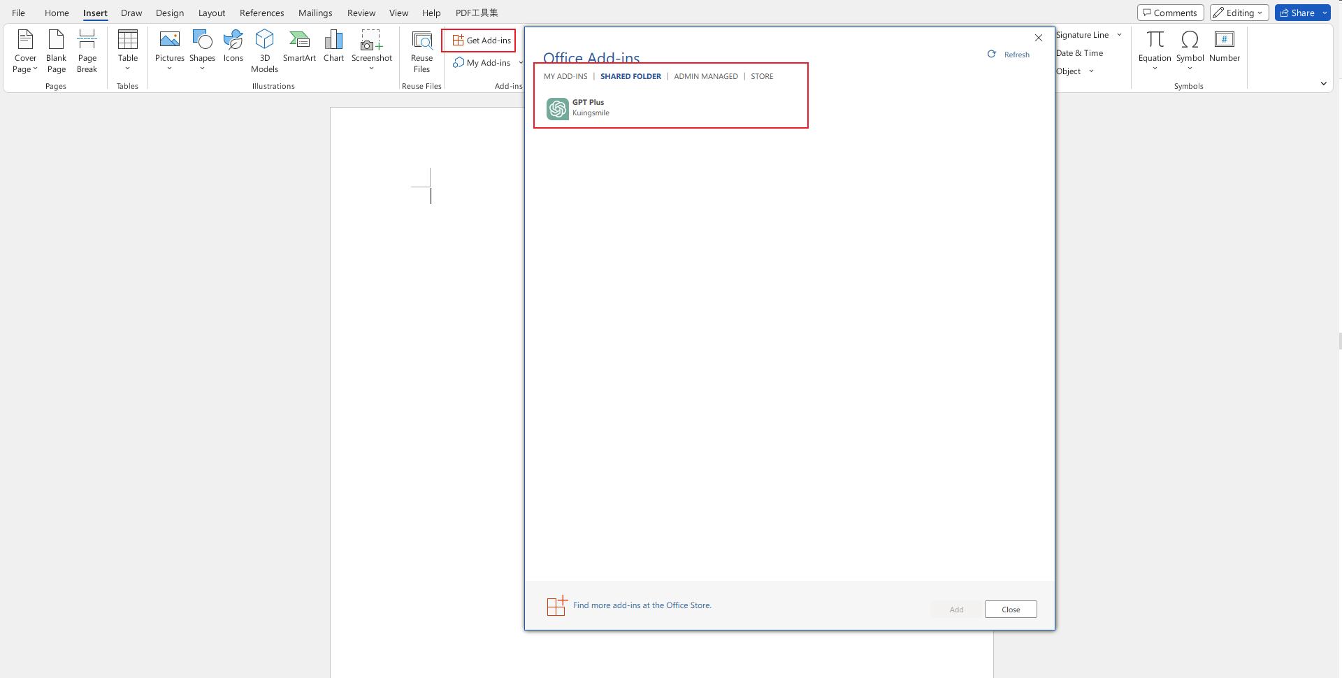 Click Insert > My Add-ins > Shared Folder, choose GPT Plus, and then choose Add.
